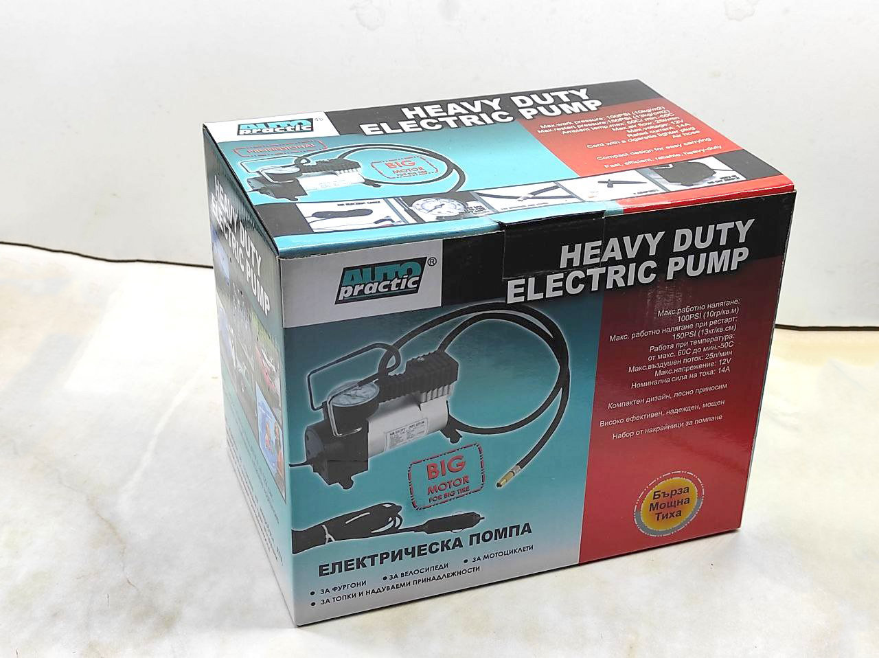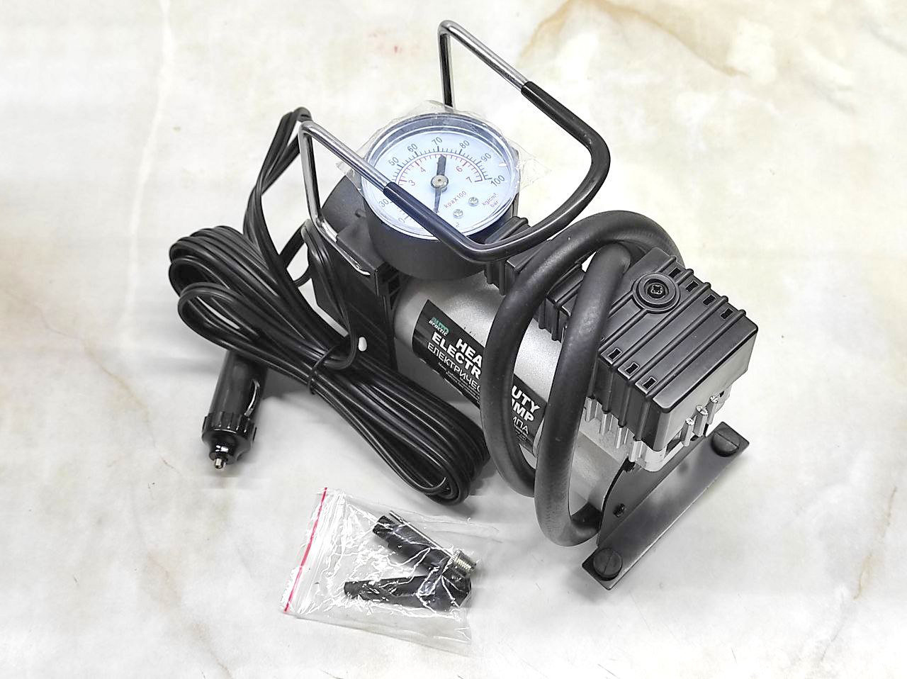 Odličan i veoma kvalitetan kompresor za gume na 12V. Moze da koriste i terenska vozila, 4x4, mini busevi i manji kamioni, dostavna vozila. Karakteristike na jednoj od slika. U kompletu kabl 2.5m i nastavak za pumpanje lopti i bicikla.